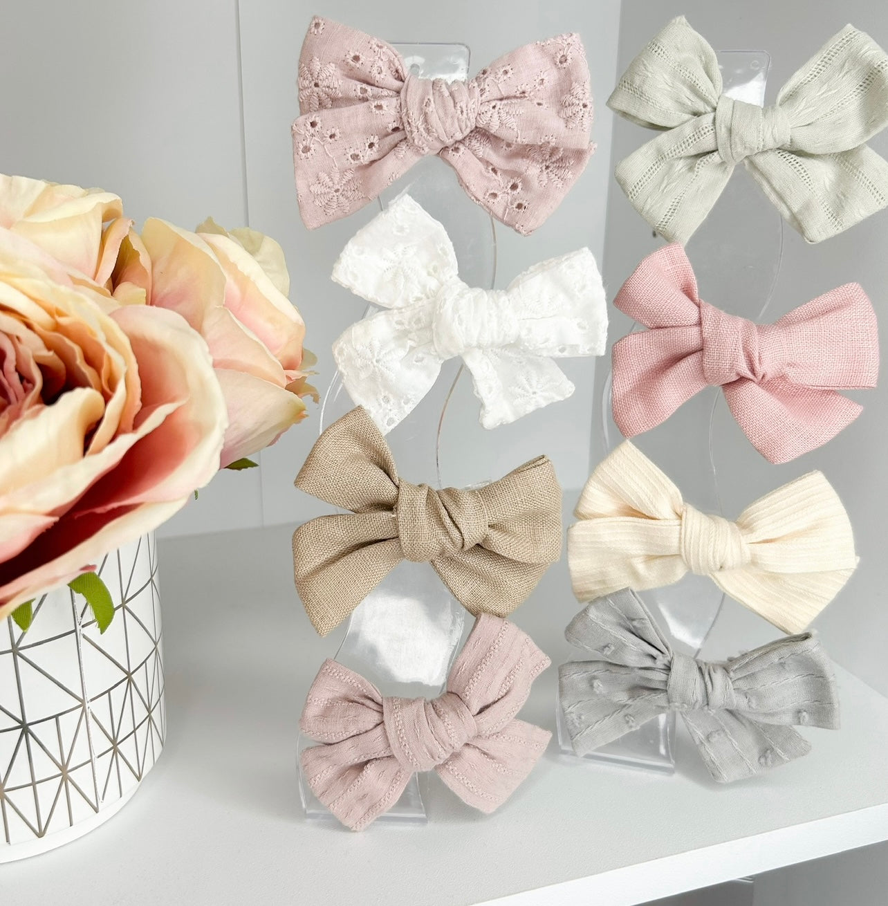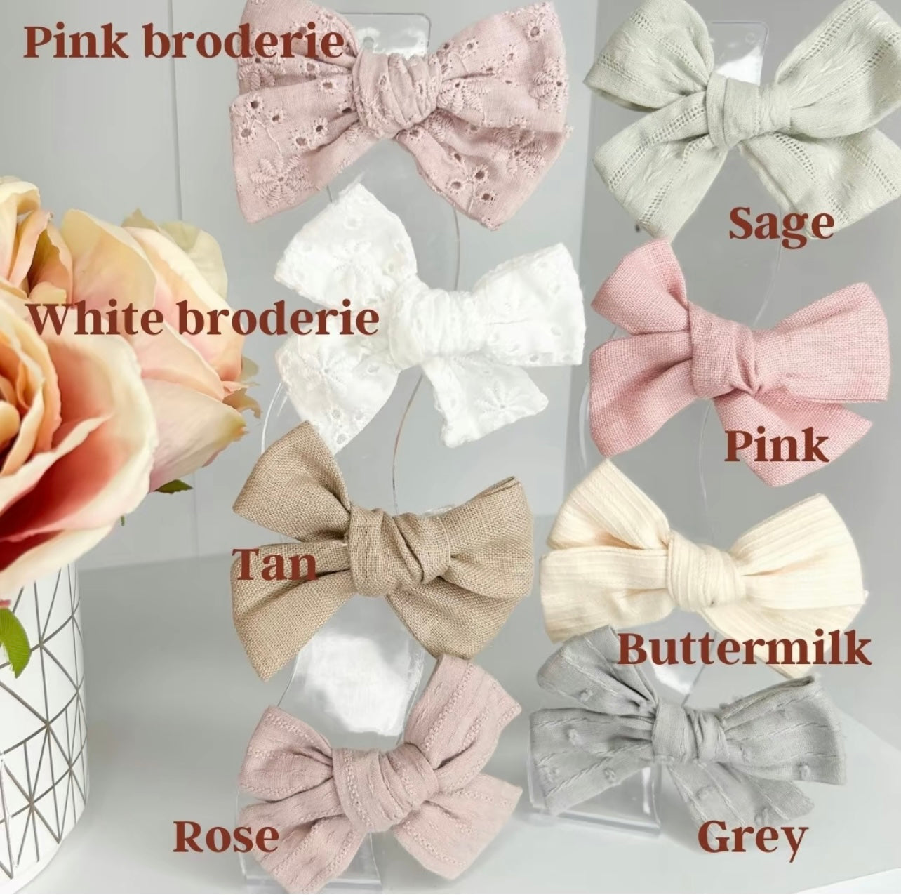 Beautiful linen handmade bow clips, Each clip has a material covered back to prevent any pulling of little ones hair.